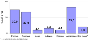 Главным и основным источником пресной воды в мире остаются реки, ресурсы которых составляют чуть более 2 тыс. км3. В среднем данный источник возобновляется в течение года 23 раза. Таким образом, в распоряжении человечества имеется 47 тыс. км3 пресной воды ежегодно. Нельзя не учитывать, что более половины русловых пресных вод стекает в океан и смешивается там с соленой водой, так что реально для водозабора остается не так уж много – около 15 тыс. км3 в год. В среднем, на 1 жителя планеты приходится около 13-14 тыс.м3 пресной воды в год. При этом доступными для использования в хозяйственном обороте являются только 2 тыс.м3 на 1 человека в год, или 6-7 м3 в сутки – это объем одной средней автоцистерны для перевозки воды. За счет этой воды обеспечивается производство продовольствия, переработка полезных ископаемых и работа промышленности, а также вся инфраструктура для «среднего жителя».