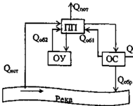 ПП - производственный процесс; ОС - очистные сооружения; ОУ - охладительные установки; Qист вода, подаваемая от источника; Qпот- вода, безвозвратно потребляемая предприятием; Qшл- вода, удаляемая со шламом; Qсбр- вода, сбрасываемая в водоем; Qоб1-оборотная вода после очистки; Q об2- оборотная вода после охладительных установок; Qподпитки - вода, подаваемая от источника на восполнение ее потерь в процессе использования; Qзамк.1- вода, возвращаемая в процесс после очистки; Qзамк.2- вода, возвращаемая в процесс после охлаждения.