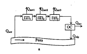 Широкое распространение получило повторное (последовательное) использование водных ресурсов. При этой системе водоснабжения вода используется последовательно в нескольких производственных процессах или в оборудовании без дополнительной обработки и очистки, или после соответствующей очистки (рис.1a). Особенно часто такой способ встречается в отделочном производстве при промывке или крашении продукции.