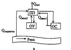 Основным направлением уменьшения сброса сточных вод и загрязнения ими водоемов является создание замкнутых систем водного хозяйства. Под замкнутой системой водного хозяйства промышленного предприятия понимается система, в которой вода используется в производстве многократно без очистки или после соответствующей обработки, исключающей образование каких-либо отходов и сброс сточных вод в водоем (рис. 1в).