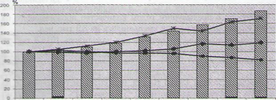 Динамика ВВП, выбросов загрязняющих веществ, образования отходов производства и сбросов сточных вод на территории Беларуси за 2000-2008 гг.