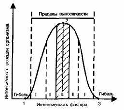 Рис. 2. Схема действия экологического фактора на жизнедеятельность организмов: 1, 2. 3 — точки минимума, оптимума и максимума соответственно; I, II, III—зоны пессимума, нормы и оптимума соответственно.