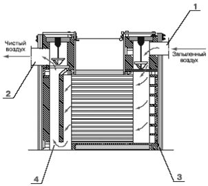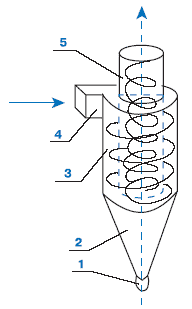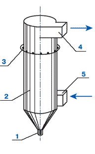 На рис. 3 представлен циклон с водяной пленкой. Запыленный воздух подается через воздуховод (5) в нижнюю часть аппарата тангенциально со скоростью 15-21 м/с. Закрученный воздушный поток, двигаясь вверх, встречает пленку воды, стекающую вниз по поверхности цилиндра (2). Очищенный воздух отводится из верхней части аппарата (4) также тангенциально по направлению вращения воздушного потока. В циклоне с водяной пленкой нет выхлопной трубы, свойственной сухим циклонам, что позволяет уменьшить диаметр его цилиндрической части.Внутренняя поверхность циклона непрерывно орошается водой из сопл (3), размещенных по окружности. Пленка воды на внутренней поверхности циклона должна быть сплошной, поэтому сопла установлены так, что струи воды направлены по касательной к поверхности цилиндра по ходу вращения воздушного потока. Пыль, захваченная водяной пленкой, стекает вместе с водой в коническую часть циклона и удаляется через патрубок (1), погруженный в воду отстойника. Отстоявшаяся вода вновь подается в циклон. Скорость воздуха на входе циклона 15-20 м/с. Эффективность циклонов с водяной пленкой составляет для пыли размером частиц до 5 мкм - 88-89%, для пыли с более крупными частицами - 95-100%.