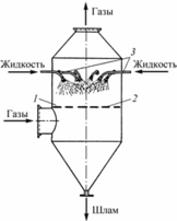 Рис. 5 - Полый форсуночный скруббер: 1 – корпус; 2 – газораспределительная решетка; 3 – форсунки
