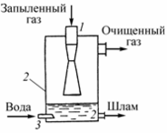 Рис. 4 - Газопромывательс центральной опускной трубой:1 – входной патрубок; 2 – резервуар с жидкостью; 3 – сопло