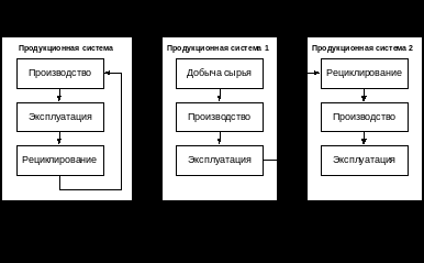- повторное использование и рециклирование подразумевает, что входные и выходные потоки, связанные с добычей и переработкой сырья и окончательным захоронением отходов, должны быть разделены между несколькими продукционными системами;
