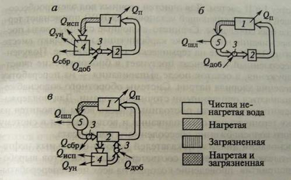 Рис. 3. Схемы оборотного водоснабжения с охлаждением (а), очисткой (б), очисткой и охлаждением (в) оборотной воды: