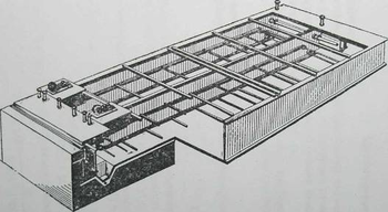 Для отстаивания нефтесодержащих сточных вод предназначаются нефтеловушки. В процессе отстаивания происходит всплывание нефти и выпадение осадка. Институтом Союзводоканалпроект разработаны типовые проекты 5 нефтеловушек открытого типа из сборных железобетонных элементов с пропускной способностью одной секции 0,005; 0,015; 0,03; 0,045 и 0,055 м3/сек. Сточная вода подводится к каждой секции нефтеловушки самостоятельно. Отделившаяся от воды нефть всплывает на поверхность и по нефтесборным трубам отводится в приемный резервуар. Для сгона нефти к сборным трубам, сбора осадка, выпавшего в нефтеловушке, и перемещения осадка в приямок предусмотрен скребковый механизм. Удаление осадка из приямка осуществляется гидроэлеватором. Днище нефтеловушек — из монолитного железобетона, стены — из сборных железобетонных панелей (см. рис. 4).