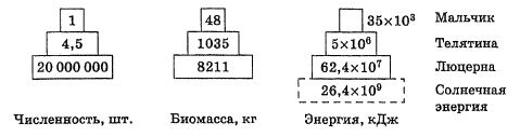 Одним из наиболее удачных и наглядных примеров классических экологических пирамид служат пирамиды, изображенные на рис. 88. Они иллюстрируют условный биоценоз, предложенный американским экологом Ю. Одумом. «Биоценоз» состоит из мальчика, питающегося только телятиной, и телят, которые едят исключительно люцерну.