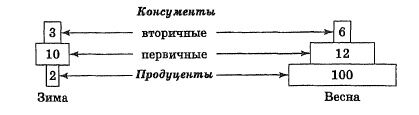 Одним из следствий описанного являются «перевернутые пирамиды» (рис. 3, б). Зоопланктон биоценозов озер и морей чаще всего обладает большей биомассой, чем его пища – фитопланктон, однако скорость размножения зеленых водорослей настолько велика, что в течение суток они восстанавливают всю съеденную зоопланктоном биомассу. Тем не менее в определенные периоды года (во время весеннего цветения) наблюдают обычное соотношение их биомасс (рис. 6)6.