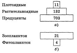 Пирамида биомасс. Экологическую пирамиду биомасс строят аналогично пирамиде численности. Ее основное значение состоит в том, чтобы показывать количество живого вещества (биомассу – суммарную массу организмов) на каждом трофическом уровне. Это позволяет избежать неудобств, характерных для пирамид численности. В этом случае размер прямоугольников пропорционален массе живого вещества соответствующего уровня, отнесенной к единице площади или объема (рис. 5, а, б)5. Термин «пирамида биомасс» возник в связи с тем, что в абсолютном большинстве случаев масса первичных консументов, живущих за счет продуцентов, значительно меньше массы этих продуцентов, а масса вторичных консументов значительно меньше массы первичных консументов. Биомассу деструкторов принято показывать отдельно.