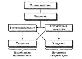 Реальные пищевые связи намного сложнее, ибо животное может питаться организмами разных типов, входящих в одну и ту же пищевую цепь или в различные цепи, что особенно характерно для хищников (консументов) высших трофических уровней. Связь между пастбищной и детритной пищевыми цепями иллюстрирует предложенная Ю. Одумом модель потока энергии (рис. 2)2.