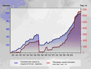 К началу 2000 г. официальное количество государственных заповедников не изменилось. Общая их официальная площадь была на уровне 33 257 тыс. га, что составляет менее 1,6% от всей территории Российской Федерации.