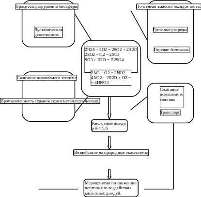 Несколько десятилетий назад выражения “кислотные осадки” и “кислотные дожди” были известны лишь исключительно ученым, посвященным в определенных, специализированных областях экологии и химии атмосферы. За последние несколько лет эти выражения стали повседневными, вызывающими беспокойство во многих странах мира. Проблема кислотных дождей стала одной из экологических проблем глобального масштаба. Кислотные осадки являются проблемой, которая в случае ее бесконтрольного развития, может вызвать и уже в некоторых регионах вызывает существенные экономические и социальные издержки. Имитационная модель возникновения кислотных дождей в атмосфере может быть использована для решения этой проблемы. Из этой модели видно, что основной причиной кислотных дождей является антропогенная деятельность. Международный исследовательский институт прикладного системного анализа (IIASA) проводит изучение моделей с целью установления возможной кислотности почв, вод и т.п. через десятки лет. Результаты говорят о том, что почвы и леса в Европе могут быть спасены от дальнейшего закисления только путем значительного сокращения выбросов. Эти выбросы должно самостоятельно регулировать каждое государство. Для уменьшения эмиссии загрязняющих веществ в атмосферу существует ряд способов: