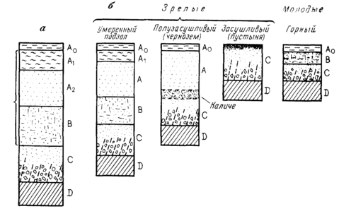 Рис. 1. Схематическое изображение почвенных профилей. а — характерные почвенные профили; б — климатические вариации. Ао—В — почва, образованная механическими, химическими и органическими процессами: Ао — частично разложившиеся органические остатки; А1 — гумус, зона органического накопления, имеет темную окраску; Аз — зона выщелачивания, имеет светлую окраску; В — зона накопления, коричневая до красно-бурой, плотная; С — зона эрозии коренных пород и структуры остаточных коренных пород; D — коренная порода.