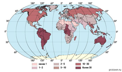 Рис. 1.2. Обеспеченность ресурсами пресной воды, тыс. м3 на душу населения в год (Глобальная экологическая перспектива..., 2002)
