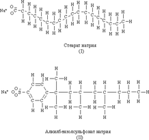 Отрицательные ионы (анионы) мыла и алкилбензолсульфоната склонны концентрироваться на поверхности раздела воды и жира. Водорастворимый отрицательно заряженный конец остается в воде, тогда как углеводородная часть погружена в жир.