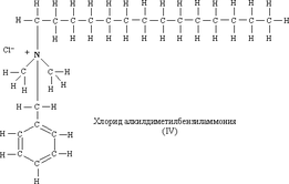 Типичный катионный детергент, хлорид алкилдиметилбензиламмония (IV), является солью четвертичного аммония, содержащей азот, связанный с четырьмя группами. Хлорид-анион всегда остается в воде, поэтому его называют гидрофильным; углеводородные группы, связанные с положительно заряженным азотом, являются липофильными.