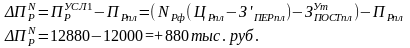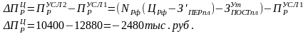 Вывод: фактически за анализируемый период предприятие получило прибыль в размере 2555 тыс. руб., при запланированном уровне прибыли от реализации 12000 тыс. руб. Снижение прибыли от реализации составило 9445 тыс. руб. Снижение прибыли от реализации произошло за счет снижения цены реализации - на 2480 тыс. руб., за счет увеличения удельных переменных затрат - на 3720 тыс. руб., за счет увеличения суммы постоянных затрат - на 4125 тыс. руб. Только увеличение объема реализации (на 4 усл. ед.) повлияло на увеличение прибыли от реализации на 880 тыс. руб.