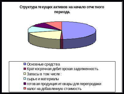 Анализ структуры текущих активов на начало отчетного периода показал, что наибольший вес в общей величине занимают основные средства 55%. Также большой вес имеют запасы. Наименьший вклад в текущие активы имеет дебиторская задолженность.