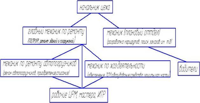 Начальником цеха №7 является Злобин А.П. ему подчиняются механики по ремонту (3 чел.), и механики из планового отдела (2 чел.). Диспетчерская служба цеха составляет 3 – диспетчеров, и 1 – экономиста. Также имеется отдельный экономический отдел который располагается в здании заводоуправления (не находится на территории цеха №7).