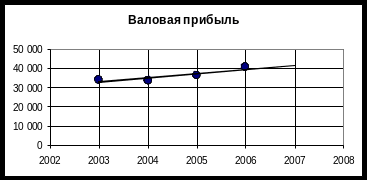 На графике построим линию тренда с прогнозом на 1 год. Валовая прибыль в 2007 году ожидается на уровне 2006 года.