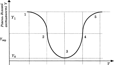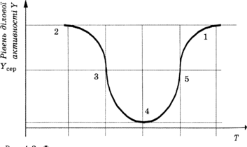 Відрізок хвилі ділового циклу від точки 1 до точки 2 на рис. 4.1 характеризується пожвавленням ділової активності, на відрізку 2–4 відбувається зниження ділової активності, що переходить у кризу в мінімальній точці активності 4 з наступним піднесенням економіки до положення 5, яке характеризує новий етап розвитку економіки (повторення хвилі економічного зростання).
