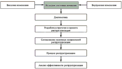 Если следовать основным принципам метода управления проектами, то можно выделить несколько этапов реализации проекта реструктуризации (Рисунок 1).