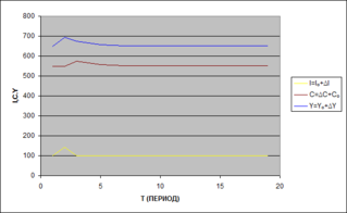 Однократный инвестиционный импульс нарушает сложившееся макроэкономическое равновесие. В результате чего потребление и ВВП сначала растет, а затем скорость изменения функций постепенно понижается, в результате сравнения инвестиционного импульса экономика приходит в первоначальное равновесие. Данная модель реально не эффективна, ее сложно использовать как методологическую абстракцию. Потребности растут, поэтому однократного импульса недостаточно для общего социального повышения потребности.