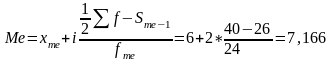 где xme - нижняя граница медианного интервала. Интервал, в котором находится порядковый номер медианы, является медианным. Для его определения необходимо подсчитать величину