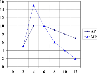 В місці перетину кривих АР і МР середня продуктивність змінного фактора є максимальною, тобто в цьому випадку досягається найефективніше використання ресурсу. Тобто найбільш раціональним буде випуск 60 одиниць продукції при затраті на виробництво 6 годин.