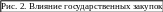 Зміна величини державних закупівель ΔG так само, як і зміна інших видів автономних витрат (споживчих витрат ΔC або інвестиційних витрат ΔI) має в кейнсианській моделі ефект мультиплікатора і викликає той же ланцюжок подій, який був розглянутий раніше у зв'язку із зміною автономних споживчих витрат.
