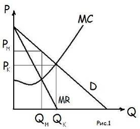 При нисходящей кривой спроса на свой продукт монополист может изменить его цену, манипулируя количеством предложенного товара, т.е. не имеет кривой предложения (только точку, соответствующую оптимальному для фирмы объему выпуска). Цель фирмы – максимизировать прибыль – достигается при условии МС=MR. Из рис. 1 видно, что MC>P.