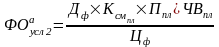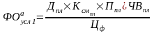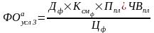 Третий условный показатель фондоотдачи рассчитывается при фактической его структуре, фактическом количестве отработанных дней, фактическом коэффициенте сменности и при плановом уровне остальных факторов: