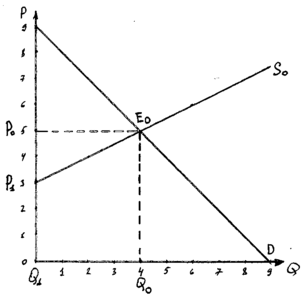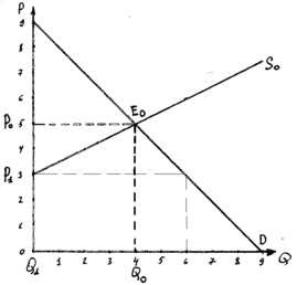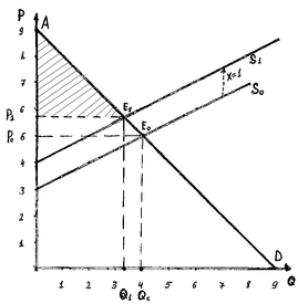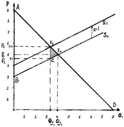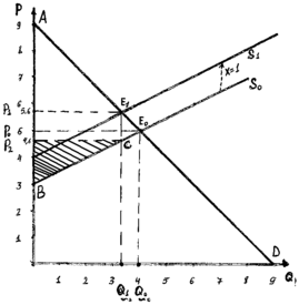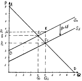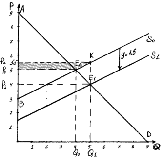 Введение потоварного налога вызовет параллельный сдвиг линии предложения вверх на величину 1. Если ранее производители согласны были предложить на рынке количество товара, Q0-4ед по цене P0 – 5 руб, то теперь они согласятся предложить на рынке то же количество товара, если только цена брутто (с включением налога) будет на 1 руб. выше, чем P0.