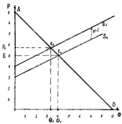 Предположим, что правительство ввело потоварный налог, уплачиваемый продавцом, в размере Х условных денежных единиц.