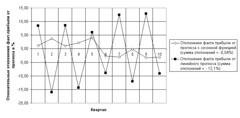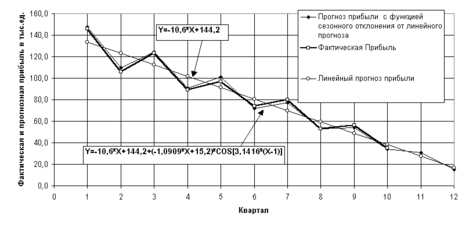 Рис. 1.3 - Результаты прогнозирования фактической прибыли уравнением мультипликативной регрессии с сезонным компонентом (гармоника с периодом в 2 квартала)
