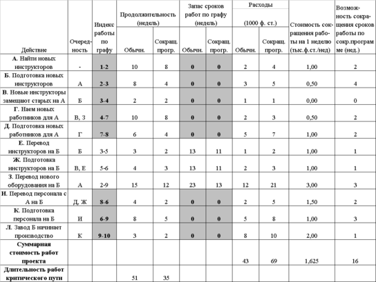 В таблице ниже приведен перечень мероприятий по расширению производства в связи с открытием второго завода. Программой расширения предусматривается перевод персонала с существующего завода (завод А) на новый завод (завод Б). Далее приведены детали этой программы, в том числе обычная продолжительность и расходы, а также сокращенная продолжительность и соответствующие расходы по каждому действию: