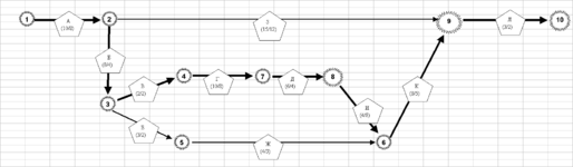 1. На рис.2.1 представлен сетевой граф в представлении событий и работ, построенный на основании логических последовательностей работ исходных данных.