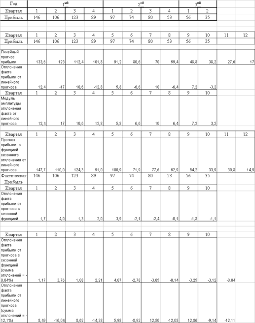 В табл. 1.1 представлены результаты расчета – прогнозирования прибыли предприятия в 11 и 12 квартале (3 и 4 квартал 3 года работы предприятия) с использованием уравнения мультипликативной регрессии с сезонным компонентом гармоники.