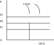 По-друге, ціна не може тривалий час перевищувати мінімальні довгострокові середні витрати (ціна p2), оскільки в цій ситуації прибуток фірми позитивний. Позитивний прибуток привертає в галузь нові фірми, що збільшить ринкову пропозицію і понизить риночну ціну. Ціна знижуватиметься до тих пір, поки знов не досягне мінімума довгострокових середніх витрат.