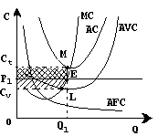 Ринкова ціна Р1 нижча за мінімальні середні витрати, але вища за мінімальні середні змінні витрати. При оптимальному обсязі виробництва Q1 величина середніх витрат виробництва складе відрізок Q1M, величина середніх змінних витрат – відрізок Q1L. Отже, відрізок ML – це середні постійні витрати. Якщо фірма продовжує працювати, то її валова виручка (прямокутник OP1EQ1) буде менше повних витрат (прямокутник OCТMQ1), але при цьому будуть покриті змінні витрати (прямокутник OCvLQ1) і частина постійних витрат. Розмір збитків вимірюватиметься площею прямокутника P1C1ME. Якщо ж фірма зупинить виробництво, то збитки складуть всю величину постійних витрат (прямокутник CvCТML). Таким чином, поки ціна вища за мінімальні середні витрати, фірмі в короткостроковому періоді вигідніше продовжувати виробляти продукцію, оскільки в цьому випадку мінімізуються збитки. Якщо ціна рівна мінімальним середнім змінним витратам, то для неї байдуже, продовжувати виробництво або зупиняти його. Якщо ж ціна впаде нижче за мінімальні середні змінні витрати, тоді виробництво продукції повинно бути припинене.