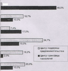 Мониторинг развития инфраструктуры предпринимательства и трансфера технологий показал, что на начало 2000 г. в Польше создано 273 центра, действующих в сфере образования и консультирования, финансовой помощи, трансфера технологий и услуг для МСП. Среди них [9]: