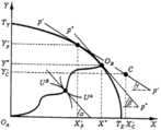 Для наглядного представления эффективной структуры выпуска в системе конкурентных цен обратимся к рис. 2.2. Для начала предположим, что соотношение цен представлено бюджетной линией. Фирмы выберут структуру выпуска, так как только в точке касания бюджетной линии с кривой трансформации цены будут равны предельным затратам для обоих благ. С другой стороны, при том же соотношении цен и соответственно бюджетной линии потребители выберут структуру потребляемых благ X'CY'C(точка С). Выбор различных наборов благ Х и Y производителями и потребителями говорит об отсутствии равновесия: имеется избыточный спрос на благо X(X'C - X'P) и избыточное предложение блага Y(Y'P - Y'C).