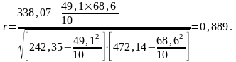 Теперь рассчитаем коэффициенты корреляции и детерминации. В случае прямолинейной формы связи между изучаемыми показателями коэффициент корреляции рассчитывается по формуле (3):