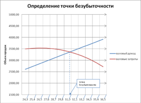 Для определения точек безубыточности производства графическим способом необходимо построить кривые валового дохода и валовых расходов, а также валовой прибыли.