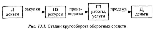 Оборотные средства функционируют одновременно в сфере производства и в сфере обращения, проходя три стадии кругооборота: снабжение, производство и сбыт (реализация). Более наглядно кругооборот оборотных средств представляет собой следующие (рис. 13.1):