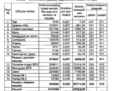 Загальновиробничі витрати розподіляють на об'єкти обліку витрат пропорційно до загальної суми витрат без вартості насіння (в рослинництві), кормів (у тваринництві), матеріалів і напівфабрикатів (у промислових виробництвах). Приклад розподілу загальновиробничих витрат наведено в таблиці 11.5.