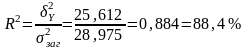 Отже, 88,4% загальної варіації виробництва продукції залежить від вартості основних засобів, а 11,6% варіації припадає на решту факторів.