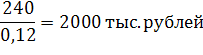 7 Рассчитать текущую стоимость бессрочного аннуитета с ежегодным поступлением 240 тысяч рублей, если предлагаемый государственным банком процент по срочным вкладам составляет 12% годовых